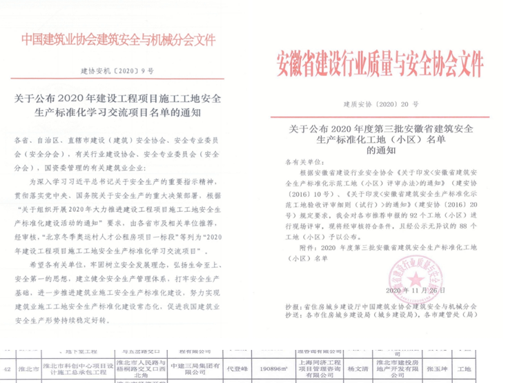 近日, 2020年中國建筑業(yè)安全生產(chǎn)管理經(jīng)驗(yàn)交流會(huì)在北京舉行。會(huì)上公布了2020年 “全國建設(shè)工程項(xiàng)目安全生產(chǎn)標(biāo)準(zhǔn)化工地”(全國AAA級安全文明標(biāo)準(zhǔn)化工地)名單。 集團(tuán)公司工程部淮北市科創(chuàng)中心項(xiàng)目工程榮獲 “全國建設(shè)工程項(xiàng)目安全生產(chǎn)標(biāo)準(zhǔn)化工地”榮譽(yù)。