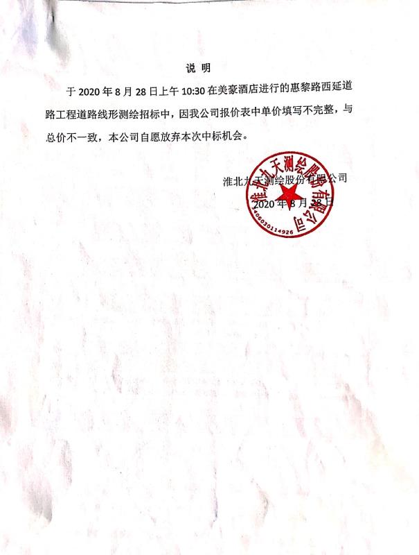 淮北市惠黎路西延道路工程 道路線形測繪詢價(jià)選聘第一中標(biāo)候選人放棄中標(biāo)資格公示
