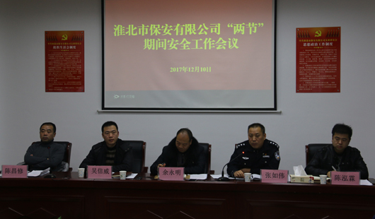 2017年12月10日晚,淮北市保安有限公司在六樓會議室召開“兩節(jié)”期間安全工作會議和講服務(wù)、轉(zhuǎn)作風(fēng)專項整頓活動啟動儀式,公司領(lǐng)導(dǎo)班子成員及市監(jiān)管支隊政委張如偉同志出席會議。
