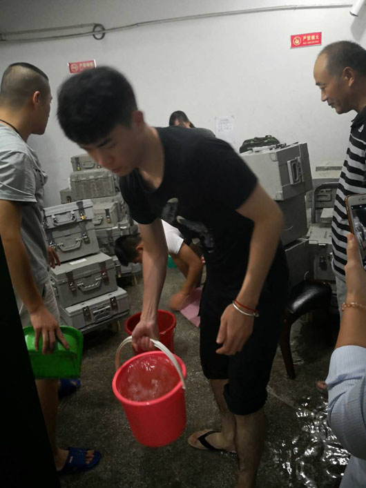 19日清晨,由于雨勢(shì)較大,加之街道排水不暢,濉溪農(nóng)商銀行金庫(kù)進(jìn)水被浸泡?;幢笔斜0灿邢薰狙哼\(yùn)三中隊(duì)隊(duì)員與銀行金庫(kù)人員堅(jiān)守在第一線,迅速展開(kāi)自救,用事先準(zhǔn)備好的沙袋將聯(lián)動(dòng)門(mén)圍裹后,用水泵、水盆等工具將積水外排。