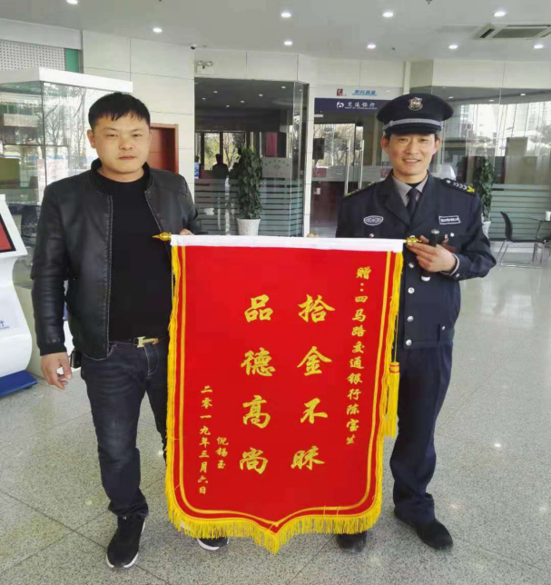 故事發(fā)生在2019年3月4日上午,陳寶生和往常一樣,在交行網(wǎng)點進行執(zhí)勤,著突然發(fā)現(xiàn)營業(yè)廳門內側有一個紅色塑料袋,走近一看,里面物品整齊,來不及多想,老陳手握著塑料袋,下意識的環(huán)顧了四周,并沒看見失主,是誰不小心把東西都丟在這兒了。鎮(zhèn)定一下之后立即上報中隊,老陳想包里會不會有一些證件之類的東西,或許能找到一些失主的線索也不一定。就和班長一起小心翼翼的打開了袋子,發(fā)現(xiàn)里面都是些合同文件和借條、憑證,價值等額有200多萬。老陳先把包妥善放好,然后通過調取監(jiān)控、在網(wǎng)點門口留下信息等方式,積極主動尋找失主。功夫不負有心人終于在下班前與失主倪先生取得聯(lián)系,認領物品時倪先生激動的熱淚盈眶,上前緊緊握住了陳寶生的雙手,說:“謝謝……真是太感謝了!我找了好幾天,都是一無所獲,如果這個包丟失,將造成200多萬元的損失,沒想到遇到了您,讓我說什么好啊!馬上拿出一疊現(xiàn)金送給老陳”