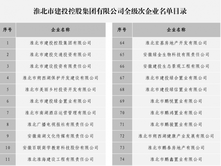 淮北市建投控股集團有限公司全級次企業(yè)名單目錄
