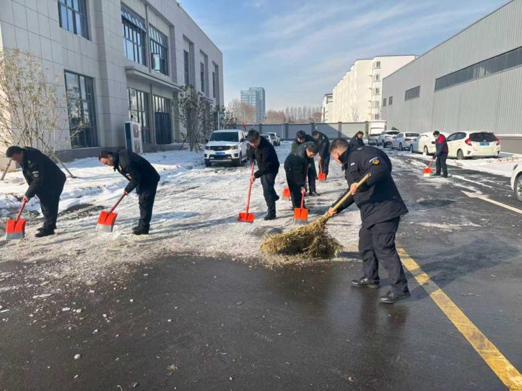 保安公司對(duì)辦公樓前、主干道等區(qū)域的積雪進(jìn)行人工清理,重點(diǎn)鏟除路面結(jié)冰區(qū)域,確保人員與車輛通行安全。